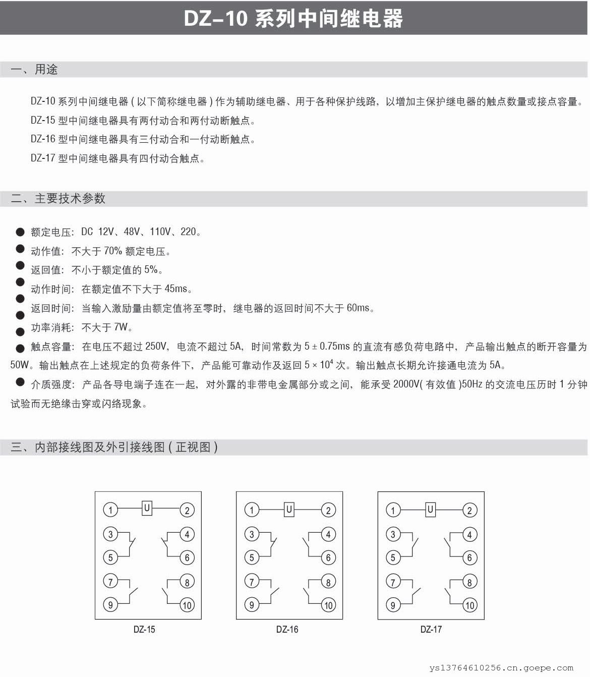 - 触点容量:在电压不超过250V,电流不超过5A,时间常数为5±0.75ms的直流有感负荷电路中,产品输出触点的断开容量为50W。输出触点在上述规定的负荷条件下,产品能可靠动作及返回5×10^4次。输出触点长期允许接通电流为5A