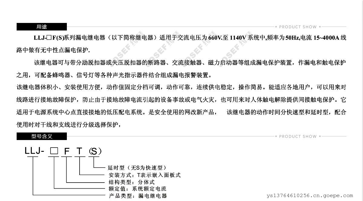 LLJ-630F(S)漏电继电器LLJ-800F(S)漏电继电器LLJ-1000F(S)漏电继电器一、产品用途及特点