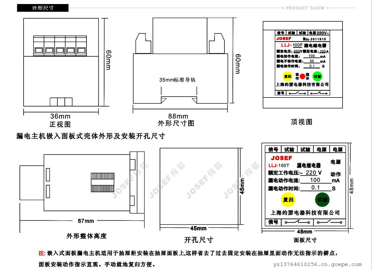 JOSEF 漏电继电器 LLJ-100FG φ45 50-500mA 卡轨安装