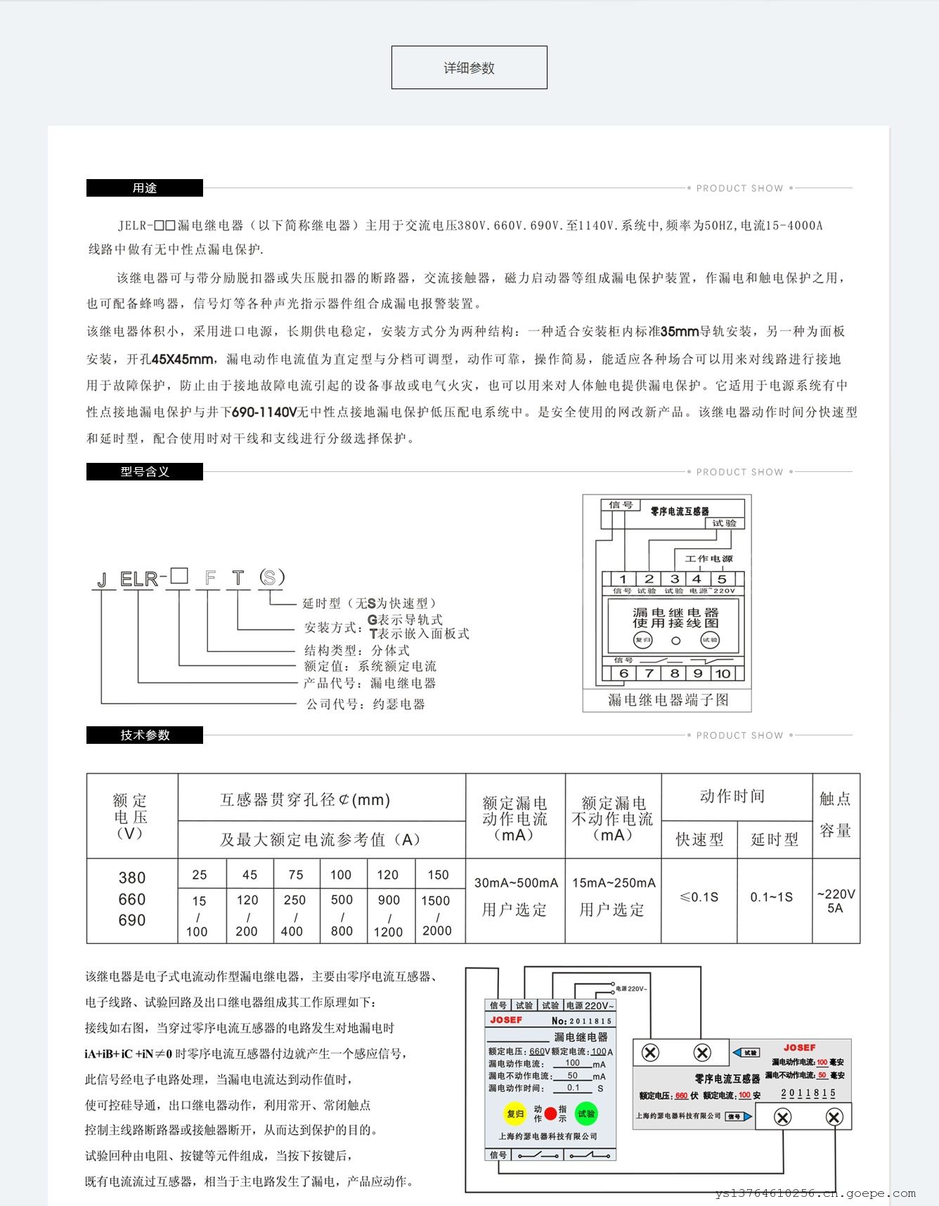 JELR-FT系列漏电继电器(以下简称继电器)适用于交流电压为660V.至1140V电压系统中,频率为50Hz,电流15~4000A线路中做有无中性点漏电保护.该继电器可与带分励脱扣器或失压脱扣器的断路器、交流接触器、磁力启动器等组成漏电保护装置,作漏电和触电保护之用,可配备蜂鸣器、信号灯等各种声光指示器件结合组成漏电报警装置。