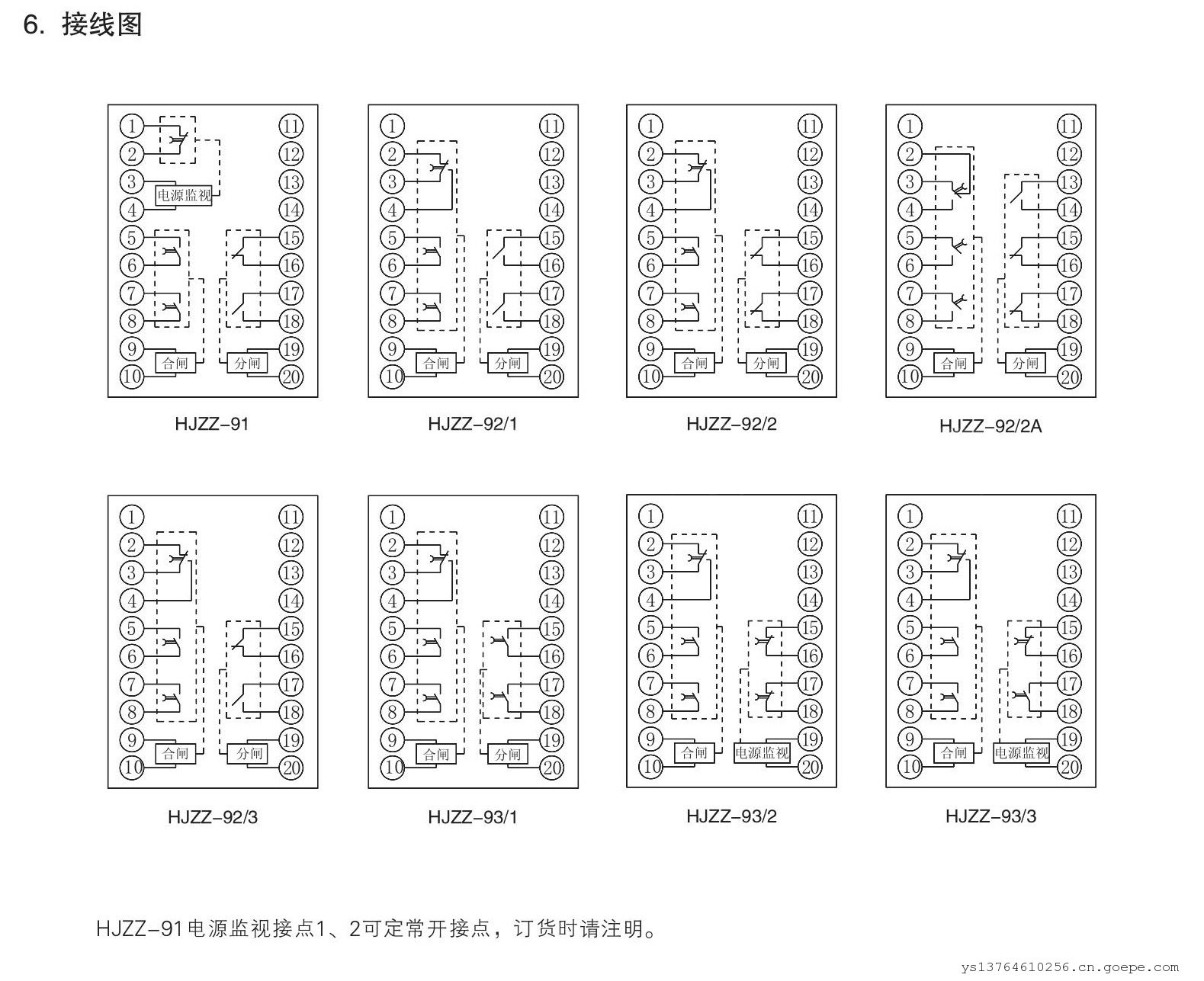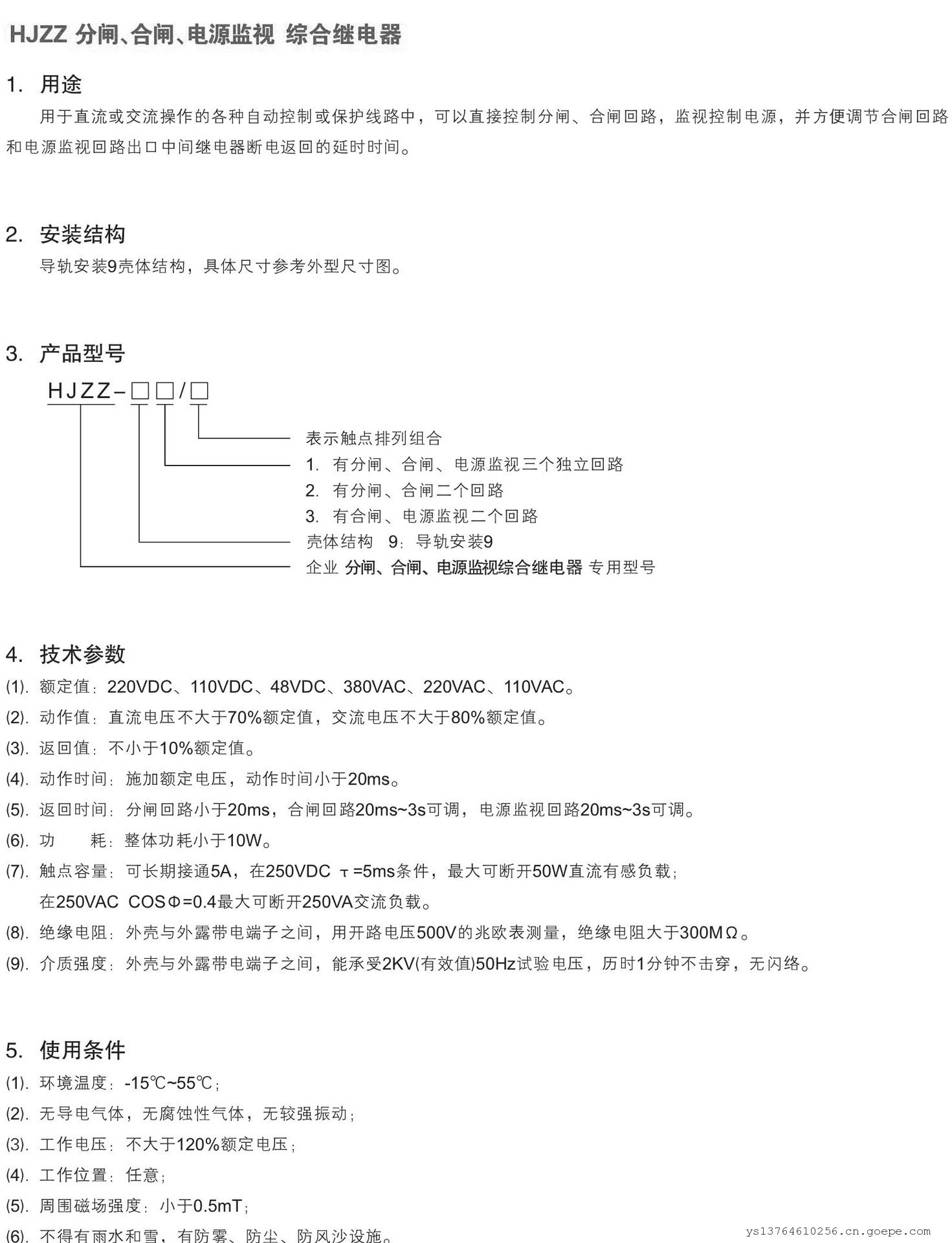 HJZZ分合闸电源监视综合继电器用于直流或交流操作的各种自动控制或保护线路中,可以直接控制分闸、合闸回路,监视控制电源,并方便调节合闸回路 和电源监视回路出口中间继电器断电返回的延时时间。