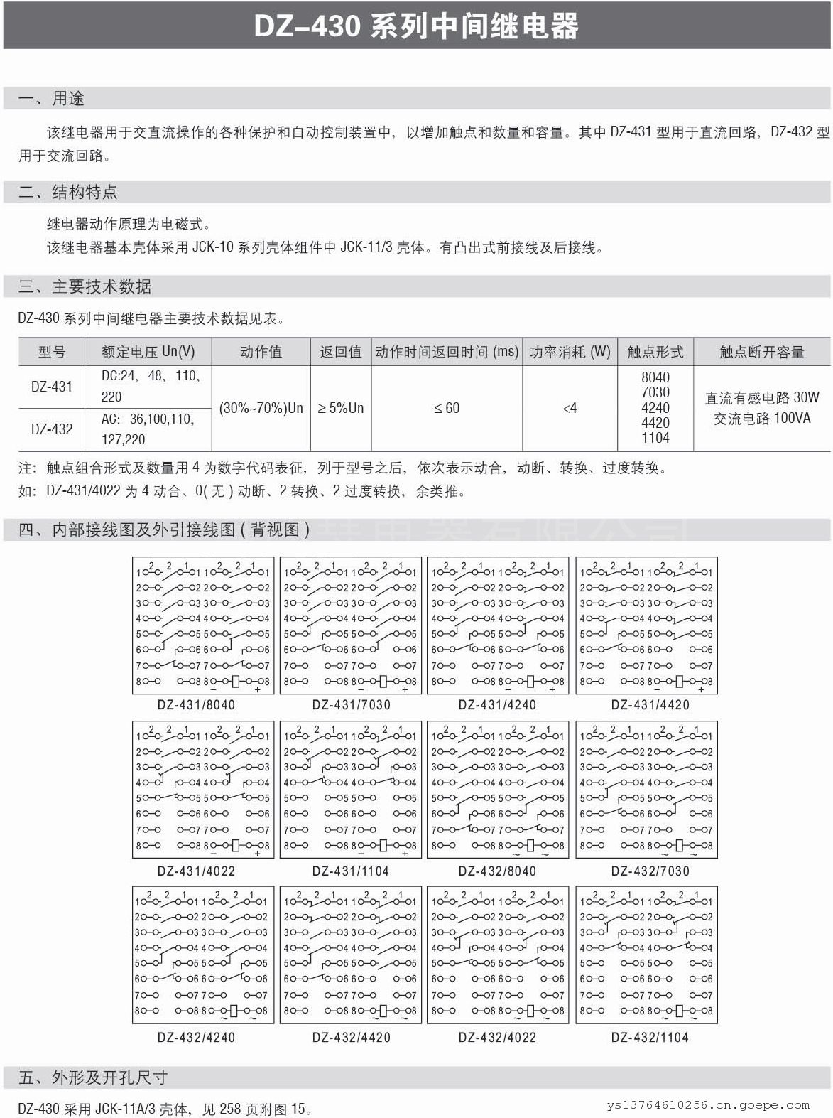 DZ-432中间继电器主要用于交直流操作的各种保护和自动控制装置中,以增加触点的数量和容量。其中,DZ-432型特别适用于交流回路。该继电器的动作原理为电磁式,其结构特点包括采用JCK-10系列壳体组件中的JCK-11/3壳体,以及具有凸出式前接线及后接线。