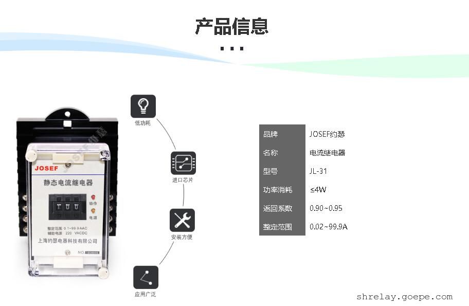 - 技术文章电流继电器 JL-11/2G 0.02~9.99A AC110V JOSEF约瑟 智能运算快,重量轻2025-10-30 11:32:00 来源:上海约瑟继电器 一、产品特性- 高精度与稳定性:采用集成电路技术,具有较高的测量精度和稳定性,能够准确反映电流变化,确保电力系统的稳定运行。