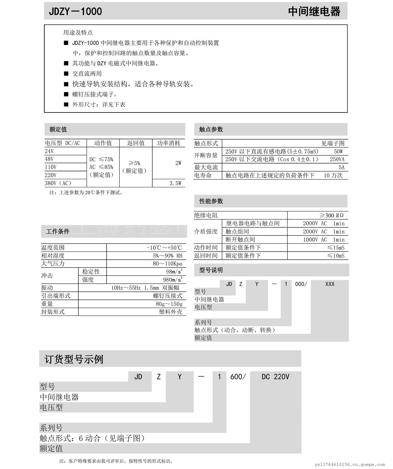JDZY-1000系列中间继电器主要用于各种保护和自动控制装置中,保护和控制回路的触点数量及触点容量。