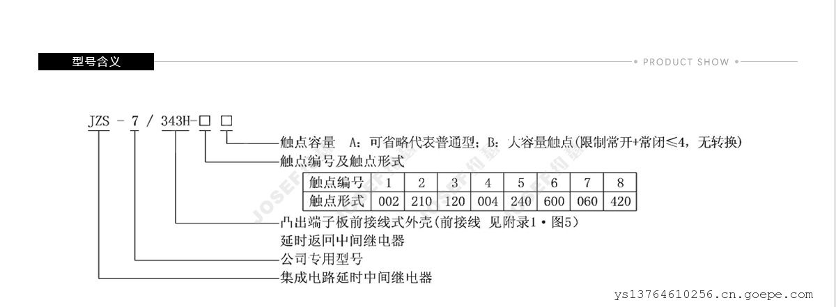 品牌:JOSEF约瑟 型号:JZS-7/343H-1 应用领域:中间 产品系列:JZS-7系列 触点负载:40W 触点切换电流:220V 系列型号: