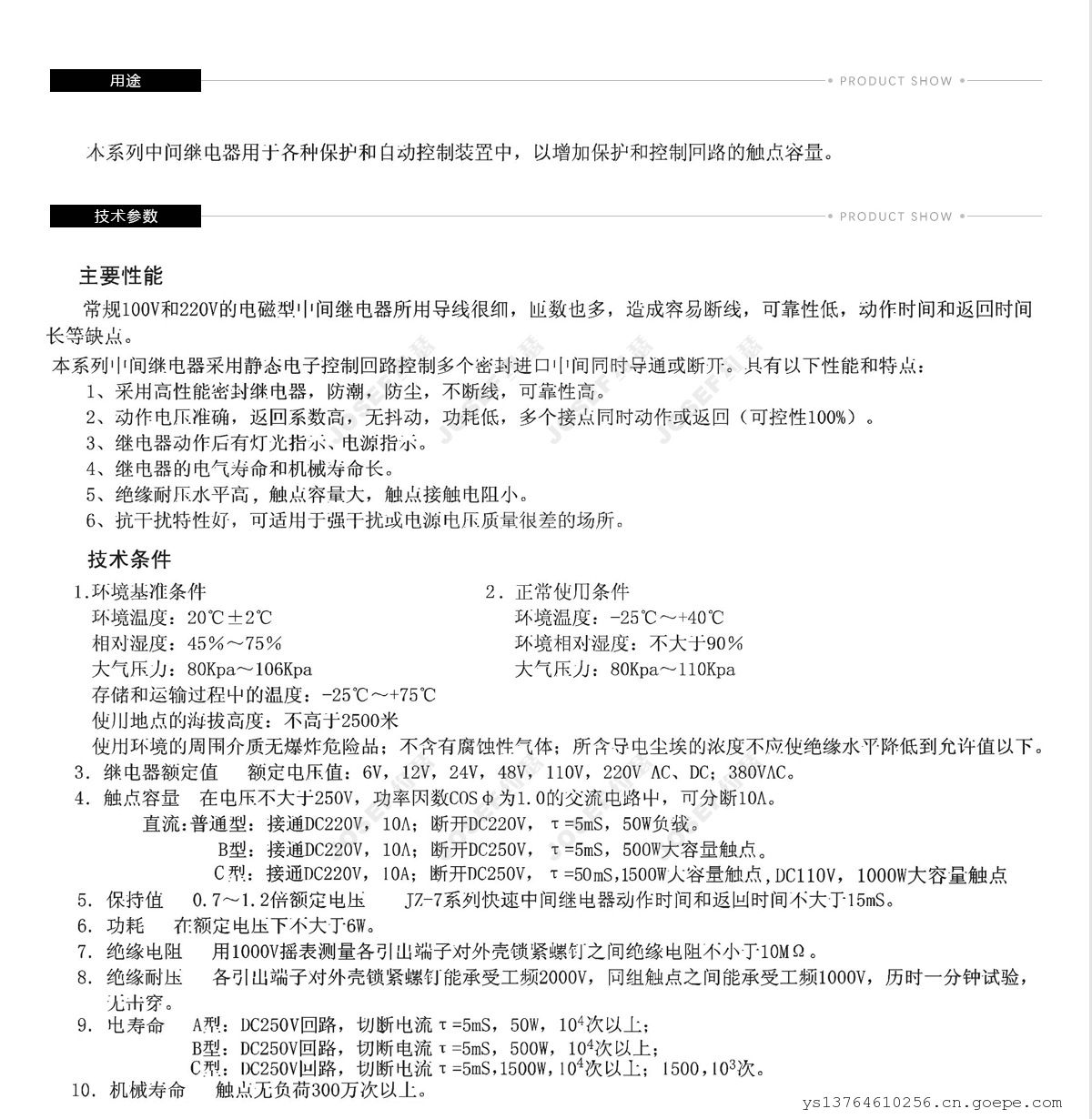 10. 机械寿命 触点无负荷300万次以上。2、主要性能