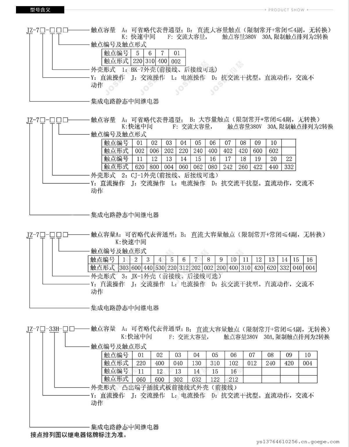 B型:接通DC220V,10A;断开DC250V,τ=5mS,500W大容量触点,极限容量为1500W。