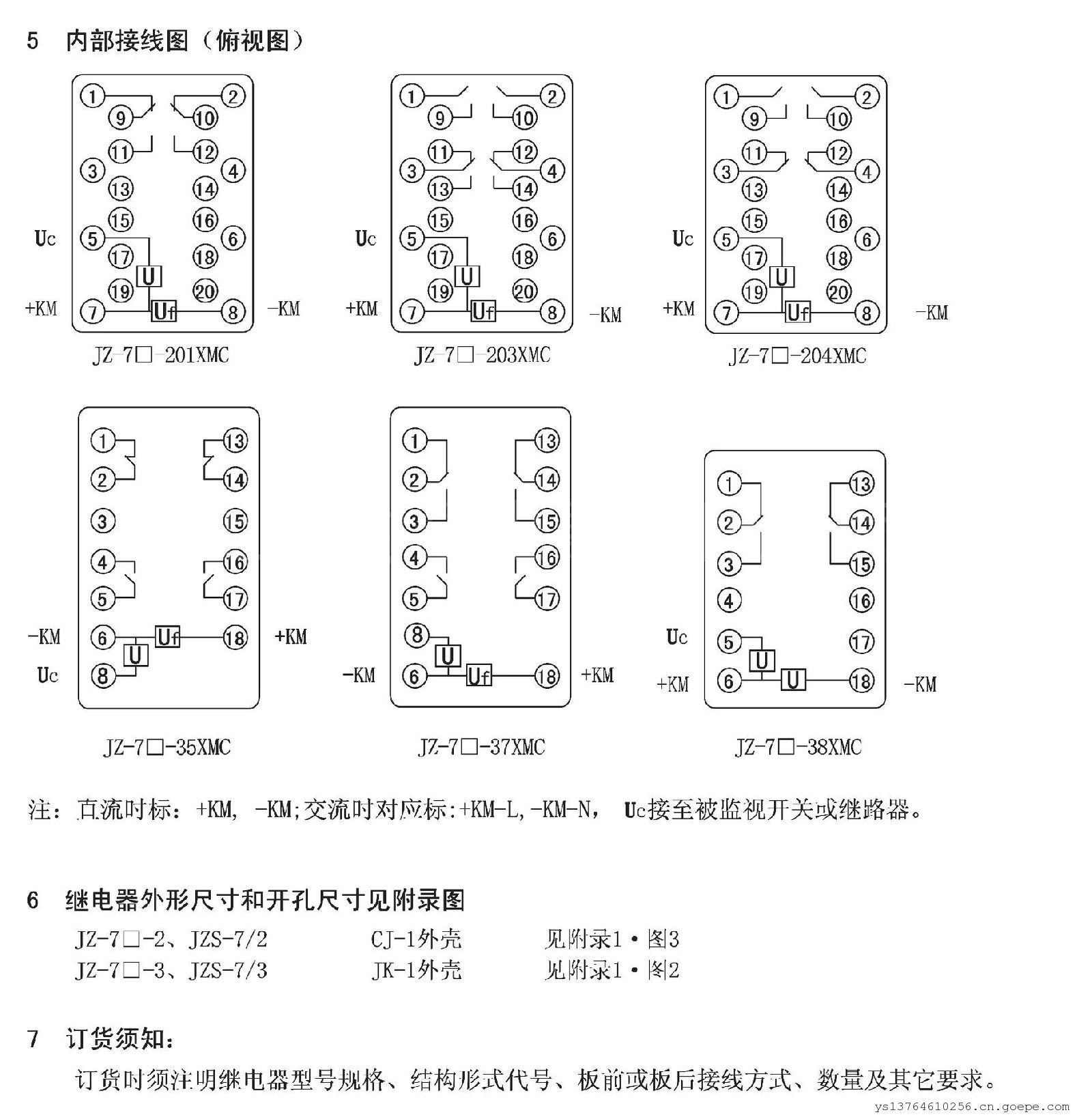 6 继电器外形尺寸和开了尺寸见附录图JZ-7J-35XMC;JZ-7Y-201XMC