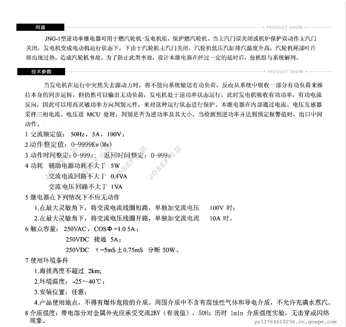 - JOSEF约瑟JNG-1逆功率继电器 50HZ 5A 100V