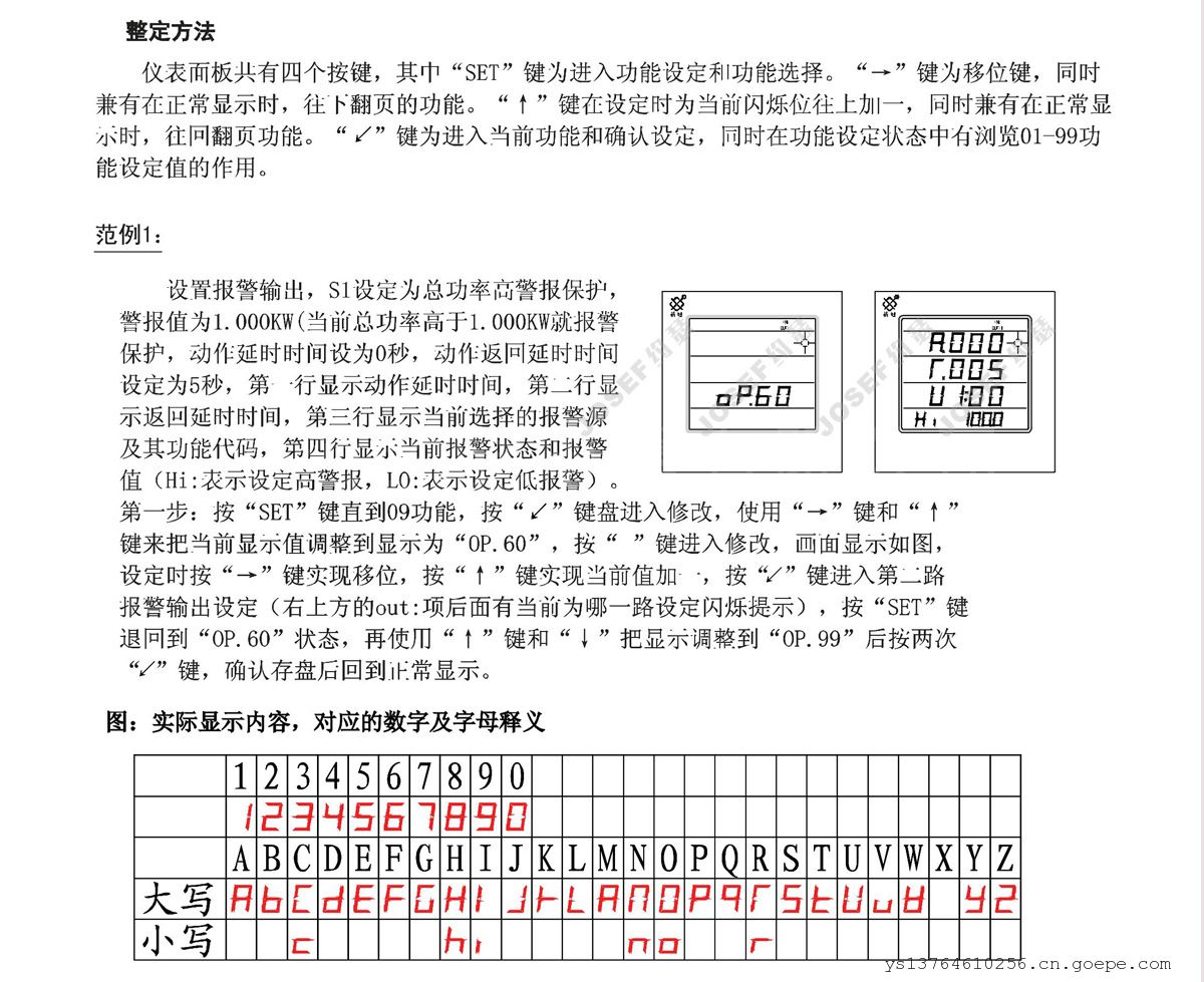 *步:按“SET”键直到09功能,按“↙”键盘进入修改,使用“→”键和“↑”键来把当前显示值调整到显示为“OP.60”,按" "键进入修改,画面显示如图,设定时按“→”键实现移位,按“↑”键实现当前值加一,按“↙”键进入第二路报警输出设定(右上方的out:项后面有当前为哪一路设定闪烁提示),按“SET”键退回到“OP.60”状态,再使用“↑”键和“↓”把显示调整到“OP.99”后按两次“↙”键,确认存盘后回到正常显示。图:实际显示内容,对应的数字及字母释义
