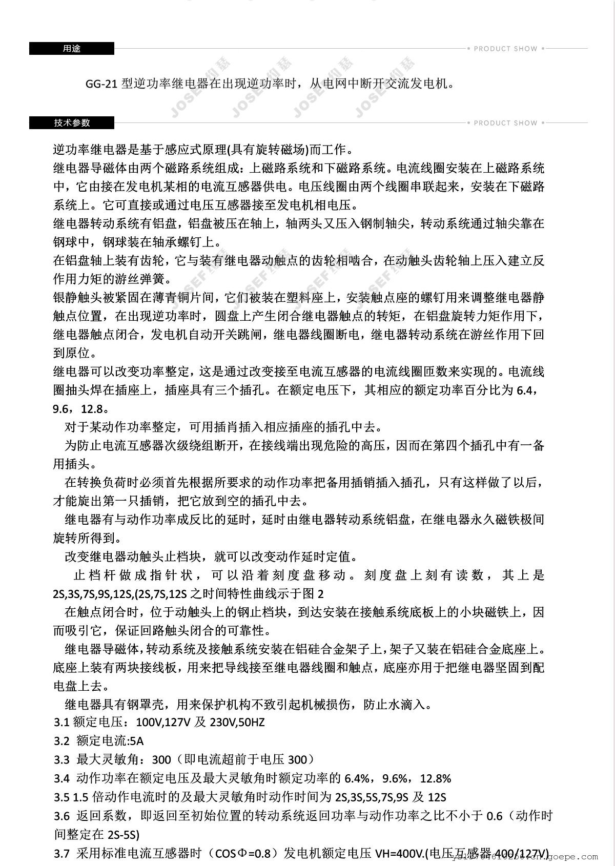 - JOSEF约瑟GG-21逆功率继电器 5A 100V