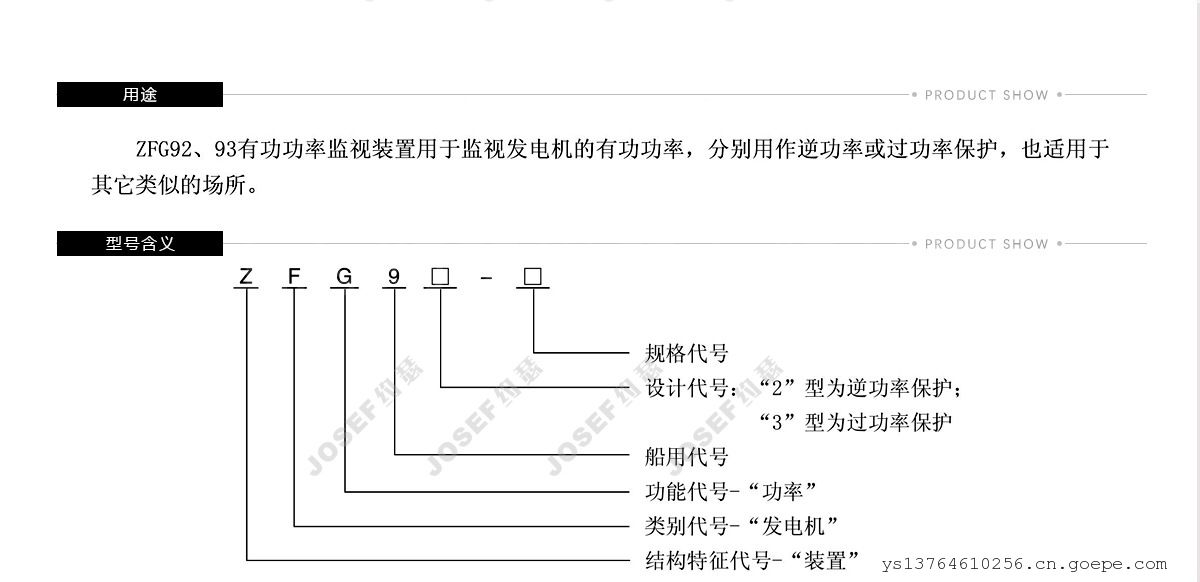 用途:ZFG92.93(SRG)有功功率监视装置用于监视发电机的有功功率,分别用作逆功率或过功功率保护,也适用于其它类似的场所。