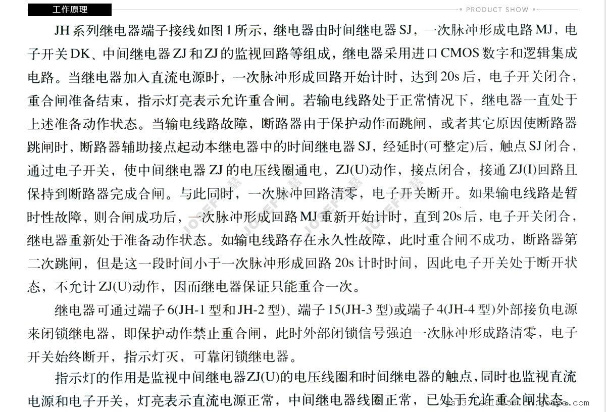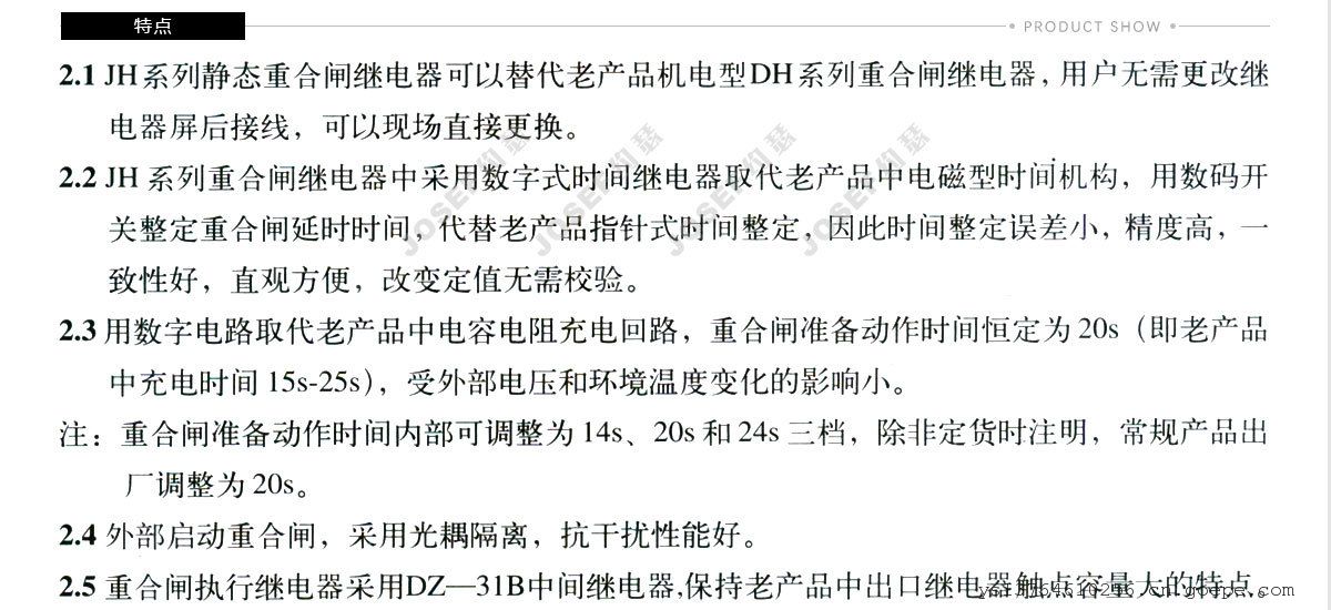 2.2JH 系列重合闸继电器中采用数字式时间继电器取代老产品中电磁型时间机构,用数码开关整定重合闸延时时间,代替老产品指针式时间整定,因此时间整定误差小,精度高,致性好,直观方便,改变定值无需校验
