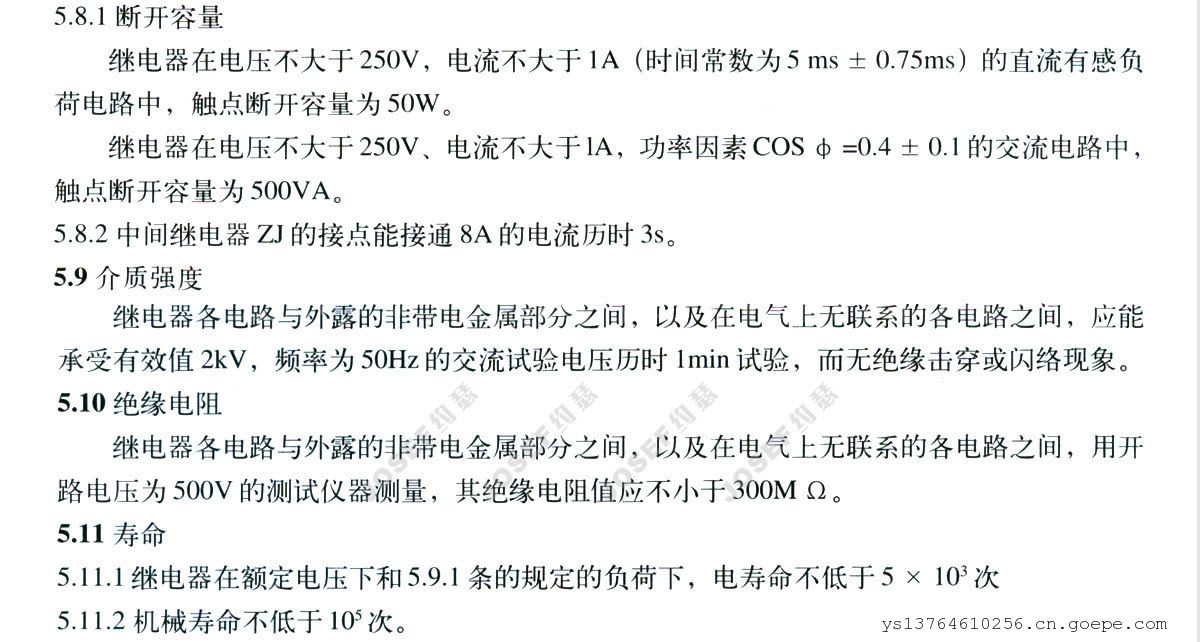 5.11.1 继电器在额定电压下和5.9.1条的规定的负荷下,电寿命不低于5 10次