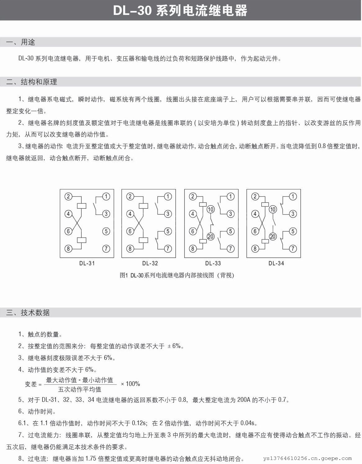 DL-30系列电流继电器用于电机保护、变压器保护和输电线的过负荷和短路保护线路中,作为起动元件。