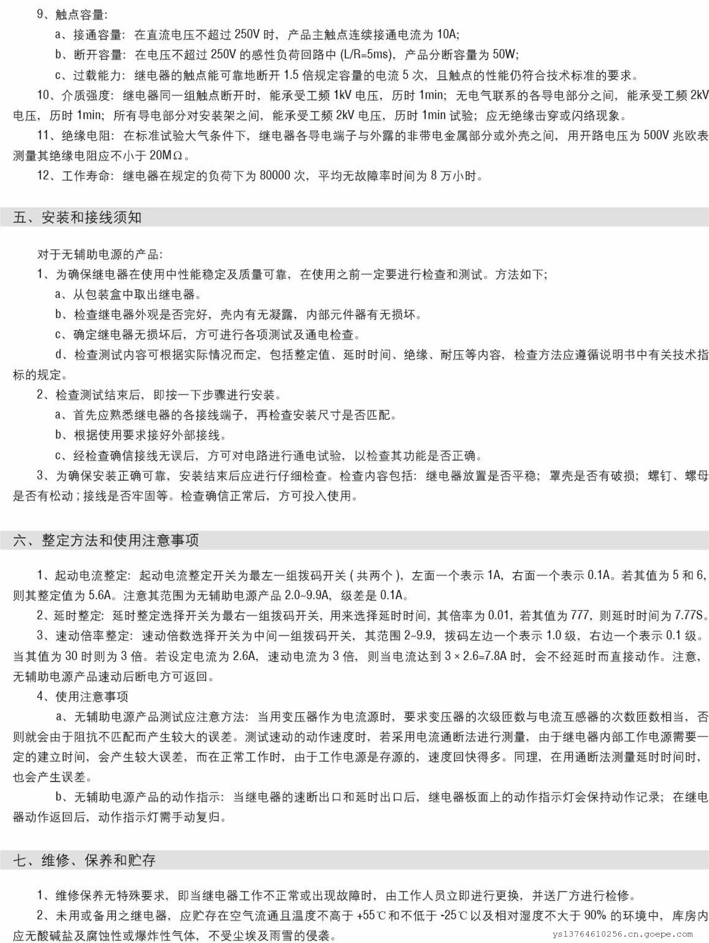 c:过载能力:继电器的触点能可靠地断开1.5倍规定容量的电流5次,且触点的性能仍符合技术标准的要求。●介质强度:继电器同一组触点断开时,能承受工频1kV电压,历时1min;无电气联系的各导电部分之间,能承受工频2kV电压,历时1min;所有导电部分对安装架之间,能承受工频2kV电压,历时1min 试验;应无绝缘击穿或闪络现象。