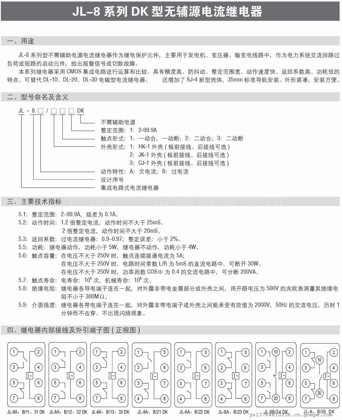 JL-8系列DK型不带辅助电源电流继电器(以下简称电流继电器)作为继电保护元件,主要用于发电机、