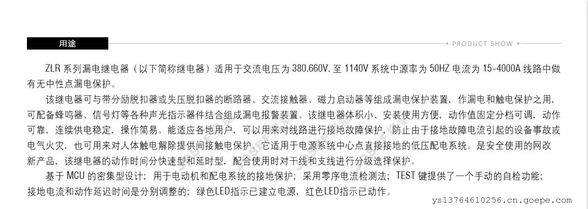 ZLR-G系列漏电继电器(以下简称继电器)适用于交流电压为380.660V.至1140V系统中源率为50HZ电流为15~4000A线路中做有无中性点漏电保护.