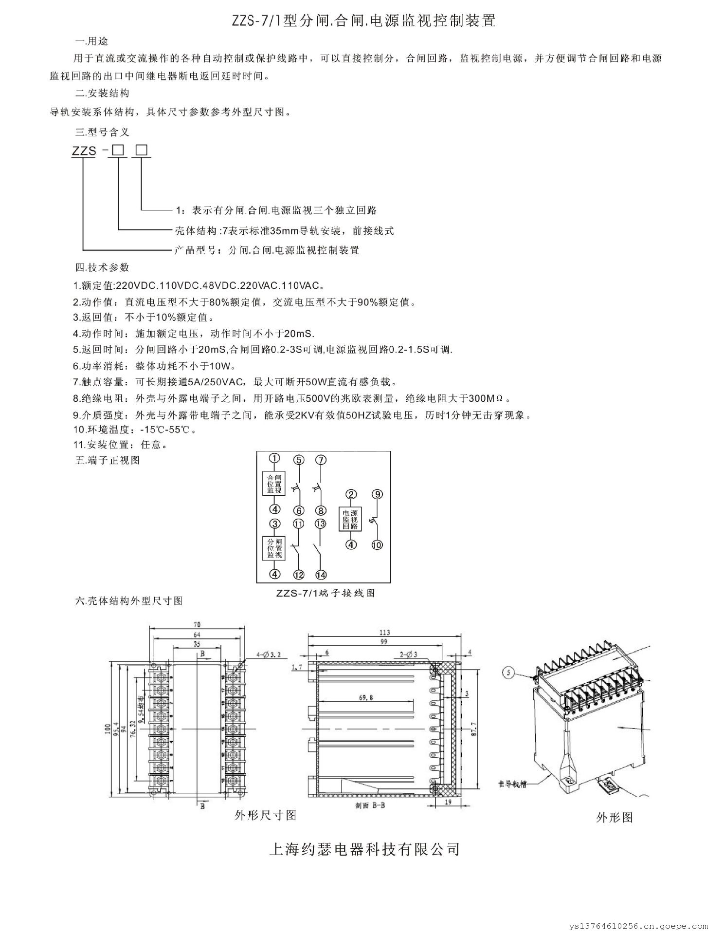 1、用途ZZS-7系列分闸合闸电源监视继电器用于直流或交流操作的各种自动控制线路中,可以直接控制分闸、合闸回路,监视控制电源,并方便调节合闸延时,电源监视断电延时。