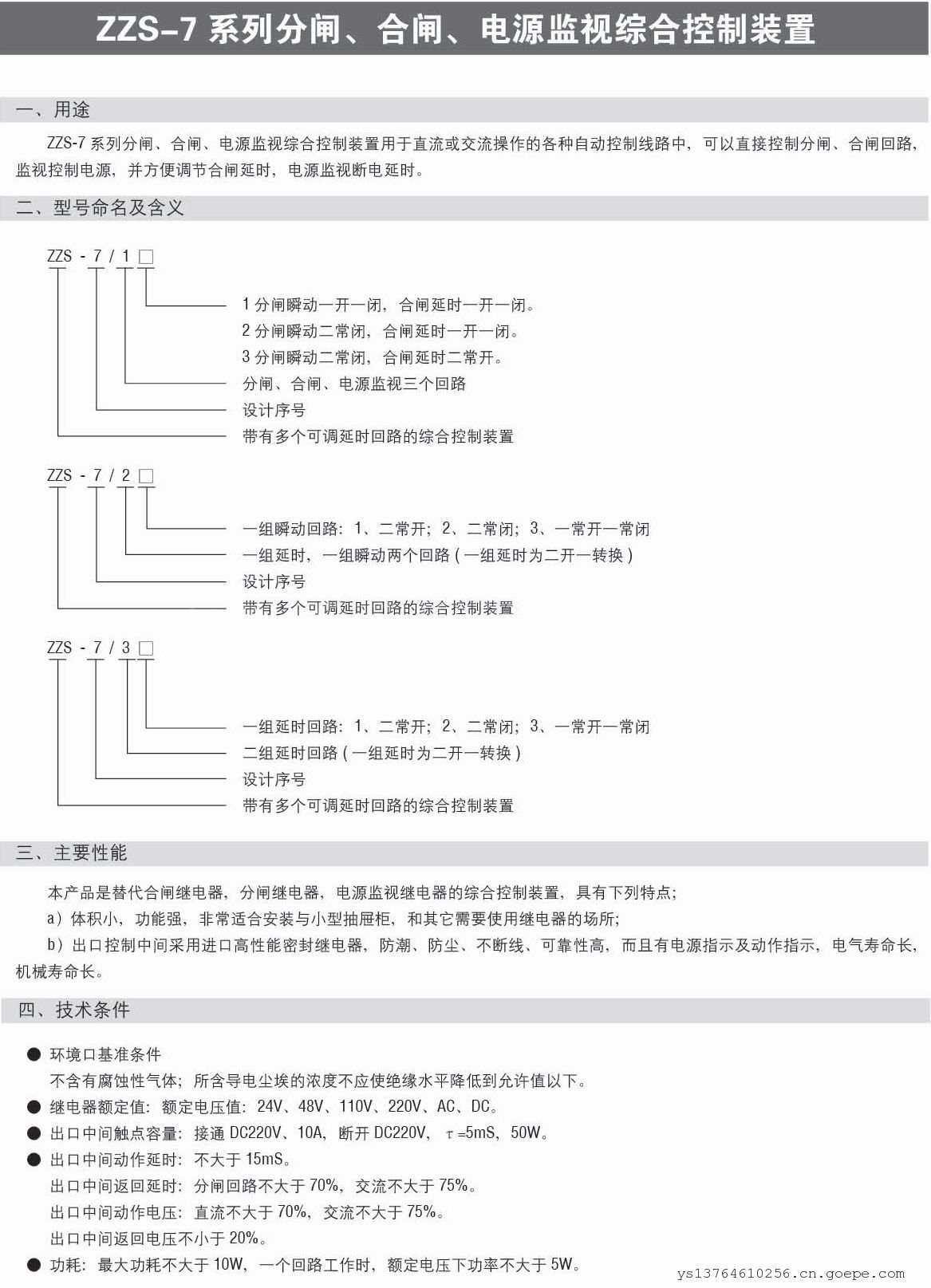 1、用途ZZS-7系列分闸合闸电源监视继电器用于直流或交流操作的各种自动控制线路中,可以直接控制分闸、合闸回路,监视控制电源,并方便调节合闸延时,电源监视断电延时。