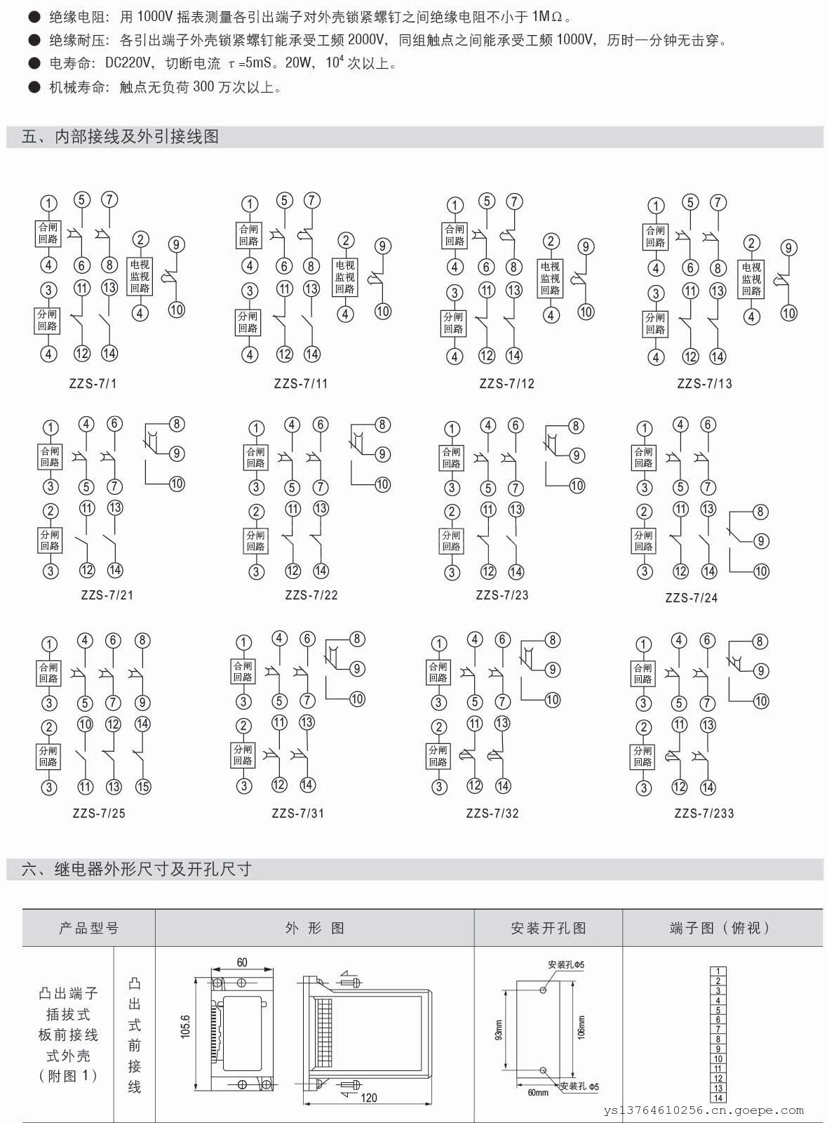 各引出端子对外壳锁紧螺钉能承受工频2000V,同组触点之间能承受工频1000V,历时一分钟无击穿。4.9 电寿命 DC220V,切断电流τ=5mS,50W,10次以上。