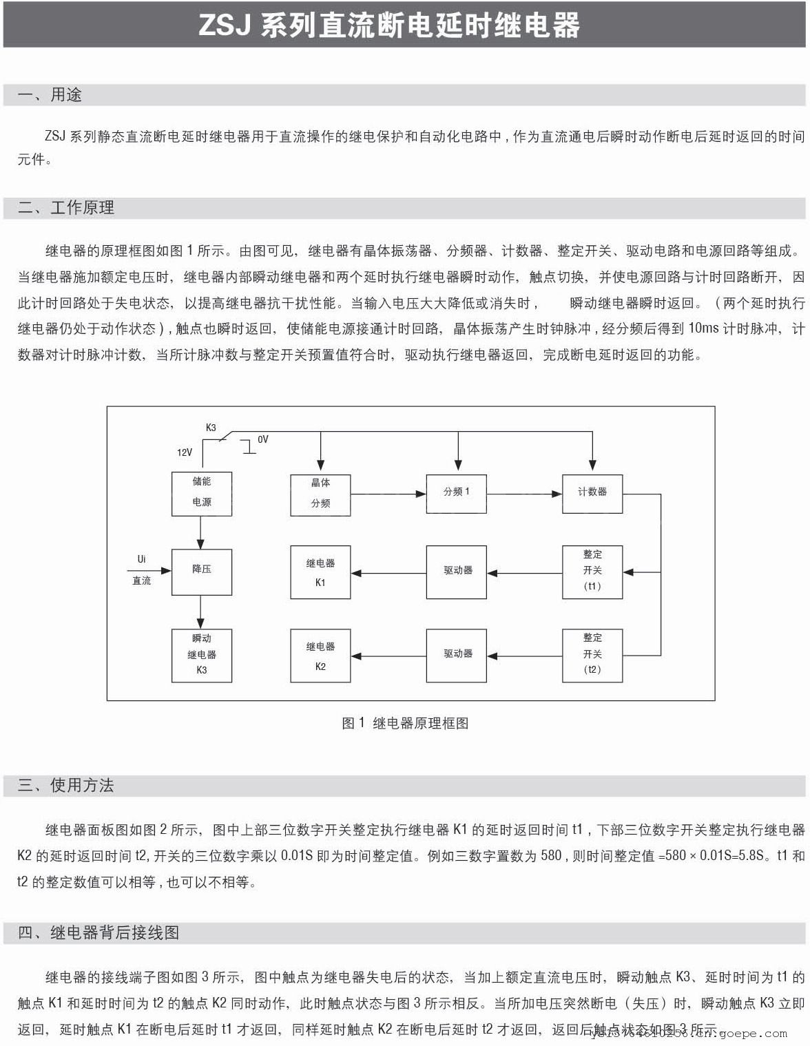用途系列静态直流断电延时继电器用于直流操作的继电保护和自动化电路中,作为直流通电后瞬时动作断电后延时返回的时间元件。