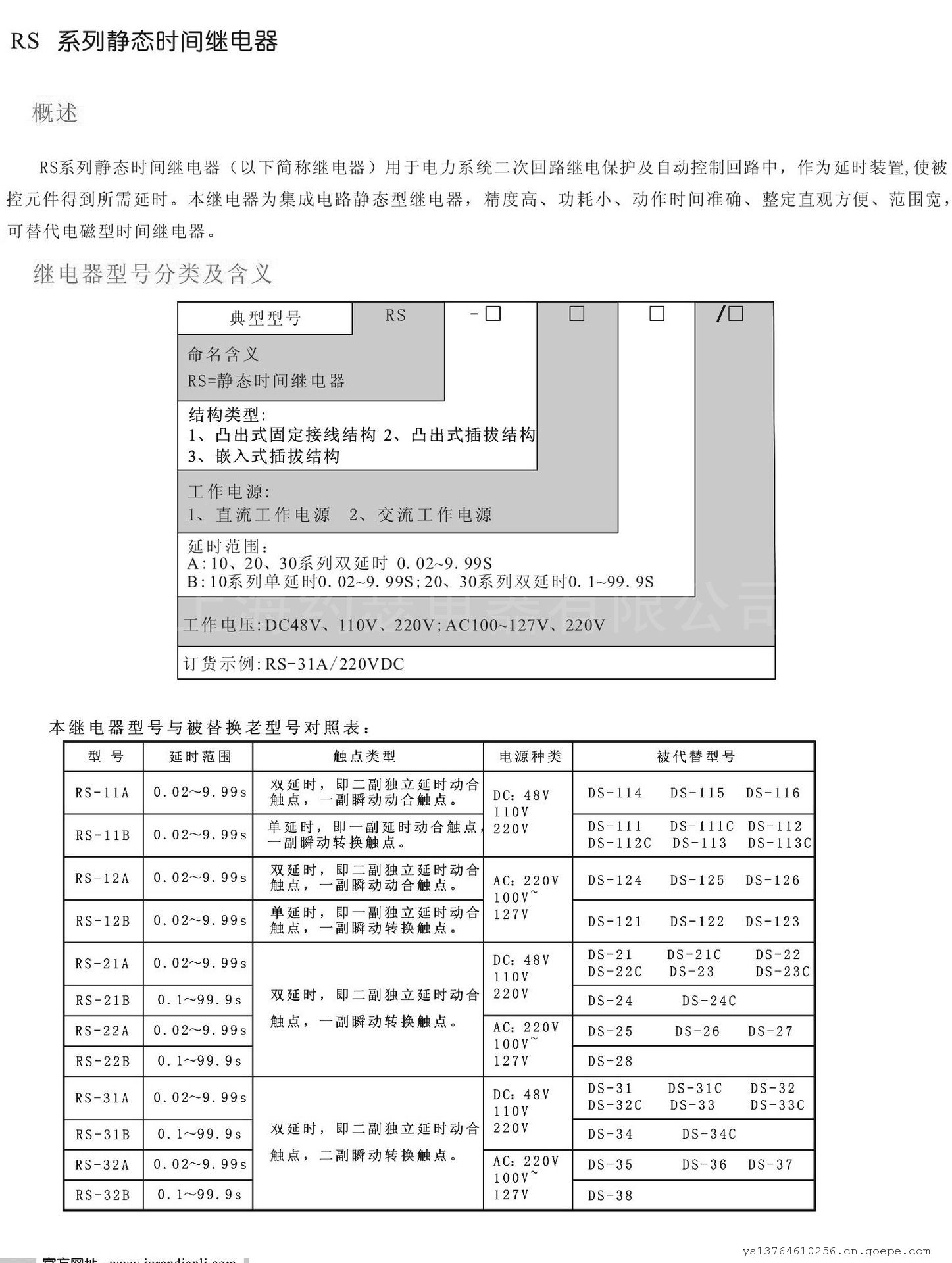 RS系列静态时间继电器(以下简称继电器)用于电力系统二次回路继电保护及自动控制回路中,作为延时装置,使被控元件得到所需延时。本继电器为集成电路静态型继电器,精度高、功耗小、动作时间准确、整定直观方便、范围宽,可替代电磁型时间继电器。