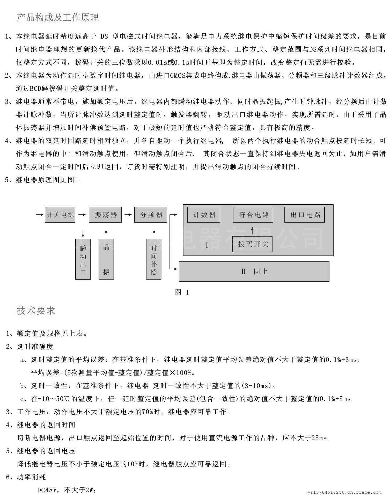 3、继电器通常不带电,施加额定电压后,继电器内部瞬动继电器动作、同时晶振起振,产生时钟脉冲,经分频后由计数器计脉冲数,当所计脉冲数达到延时整定值时,触发器翻转,驱动出口继电器动作,实现所需延时,由于采用了晶体振荡器并增加时间补偿预置电路,对于极短的延时值也严格符合整定值,具有极高的精度。