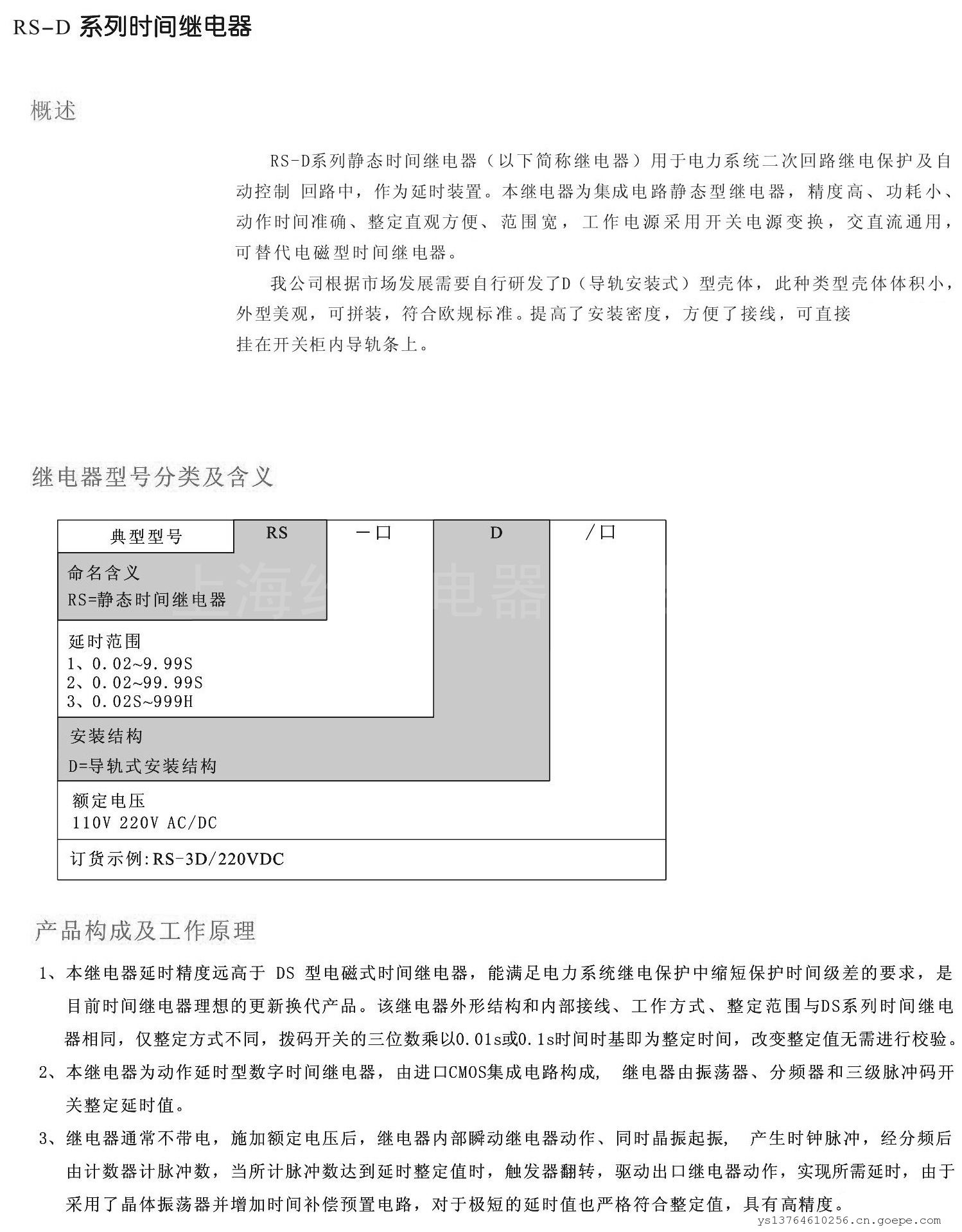 RS-D系列时间继电器用于电力系统二次回路各种保护和自动化控制线路中作为辅助继电器,以延迟动作时间并增加前一级接点的数量及接点容量。