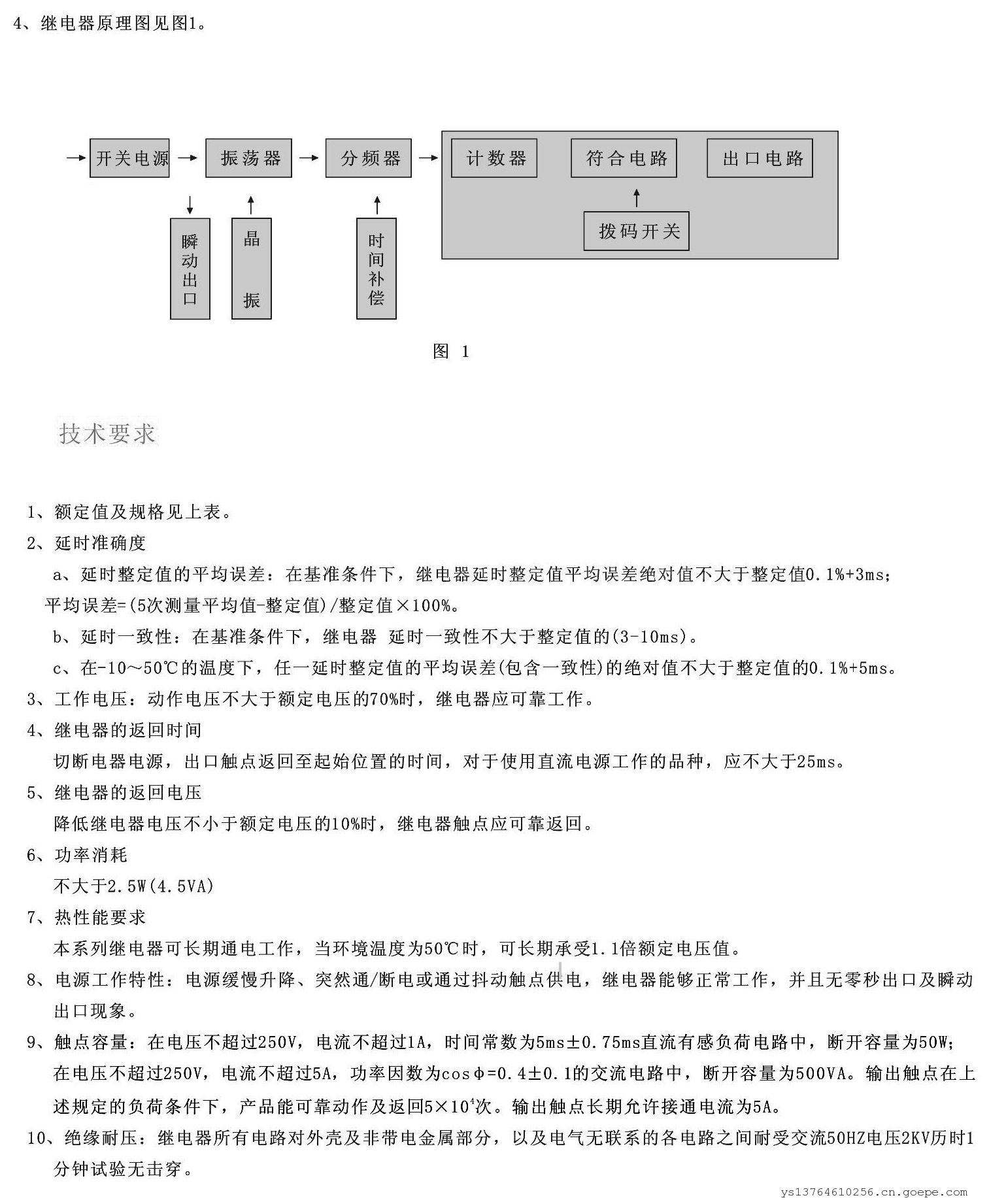 3、触点容量:在电压不超过250V,电流不超过1A,时间常数为5MS±0.75MS直流有感负荷电路中,触点断开容量不小于50W;在电压不超过250V,电流不超过5A,功率因数为COSφ=0.4±0.1的交流电路中,断开容量不小于500VA。触点在上述规定的负荷条件下能可靠动作及返回不少于50000次。触点长期允许接通电流不小于5A。