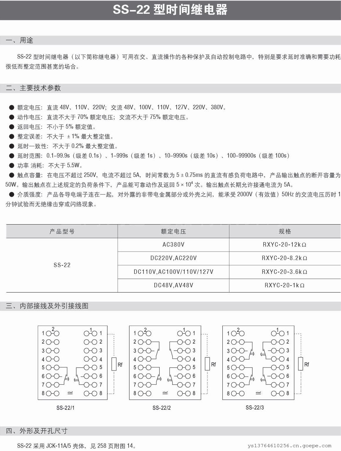 触点容量:在电压不超过250V,电流不超过5A,时间常数为50.75ms的直流有感负荷电路中,产品输出触点的断开容量为50W。输出触点在上述规定的负荷条件下,产品能可靠动作及返回5x10"次。输出触点长期允许接通电流为5A。·介质强度:产品各导电端子连在一起,对外露的非带电金属部分或外壳之间,能承受2000V(有效值)50H2的交流电压历时1分钟试验而无绝缘击穿或闪络现象。