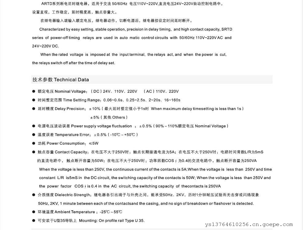 ARTD系列时间继电器是一种断电延时继电器。它具有拨码开关设置直观、工作稳定可靠、延时精度高、使用方便、触点输出容量大等优点:适用于自动控制电路中,按设定时间接通或分断电路。