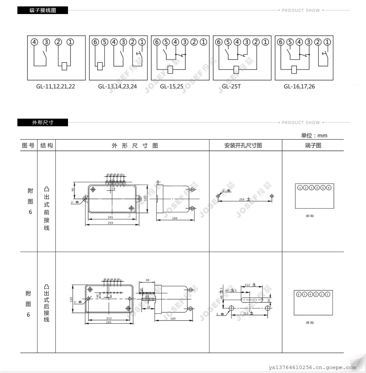 品牌:JOSEF约瑟 型号:GL-11/5A 应用领域:电流 产品系列:GL-10系列 触点负载:40W 触点切换电流:220V 系列型号: