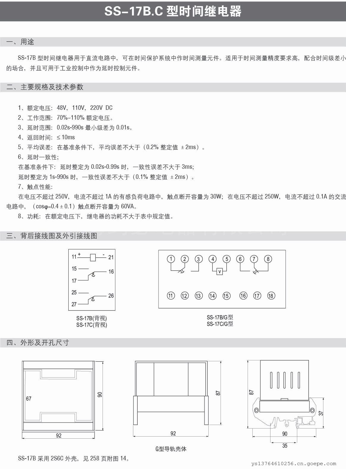 1、概述SS-17系列时间继电器用于电力系统继电保护、控制回路或工业控制的直流电路中,作为延时控制元件之用。SS-17系列采用静态集成电路,具有精度高、动作准确、可靠性高等特点,并采用导轨安装和端子排接线,可方便地卡装在导轨槽板上,具有安装方便、接线简单等优点。
