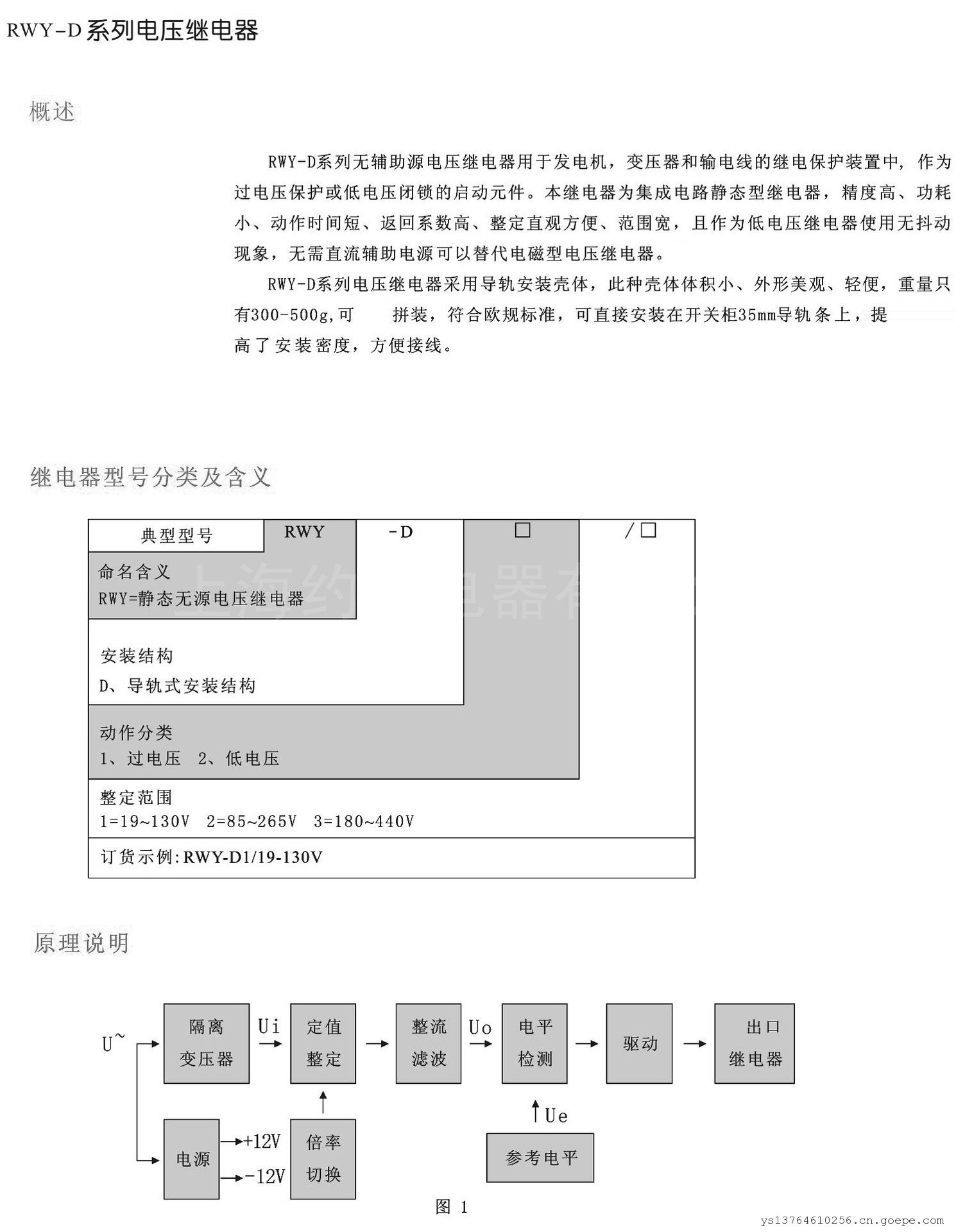 电压继电器RWY-D1/3电压AC380V 180~440V 订货时须注明继电器型号规格、额定电压等参数、板前或板后接线方式以及输出接点数。电压继电器输出接点多可输出二组转换,用户在订货时注明需要一开一闭或二常开二常闭或二转换,用户不说明一般提供一开一闭。其它接点排列可按用户要求定做