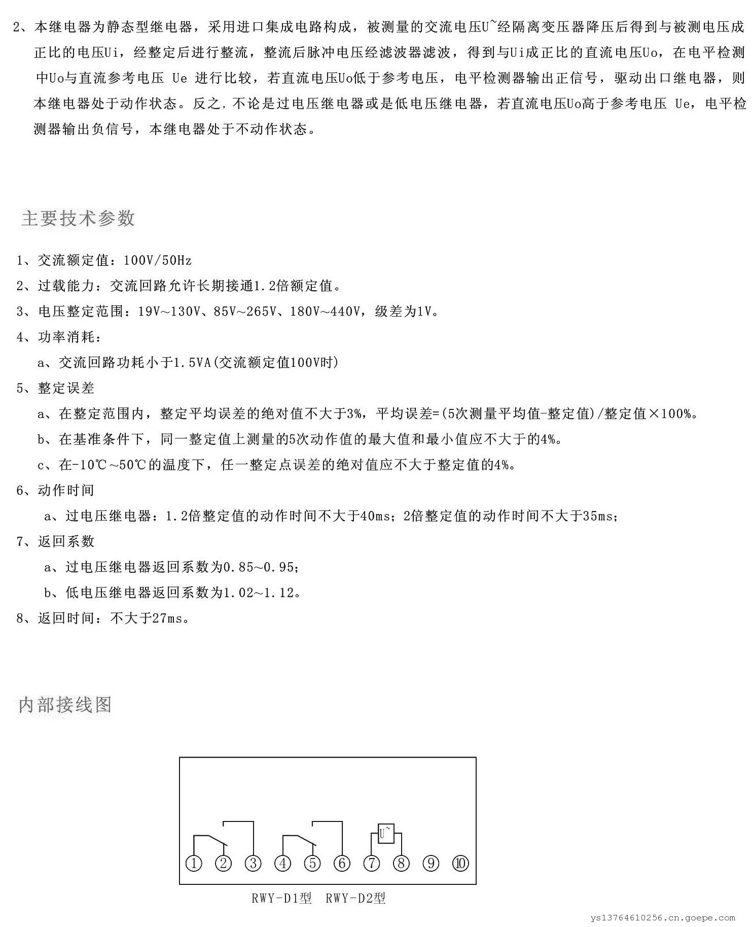 RYW-D系列电压继电器(以下简称本继电器)用于发电机、变压器和输电线的电器保护装置中,作为过电压保护或低电压闭锁的启动原件。本继电器为集成电路静态型继电器,精度高、功耗小、动作时间短、返回系数高、整定直观方便、范围宽,且作为低压继电器使用无抖动现象,无需直流辅助电源*可以替代电磁型电压继电器。