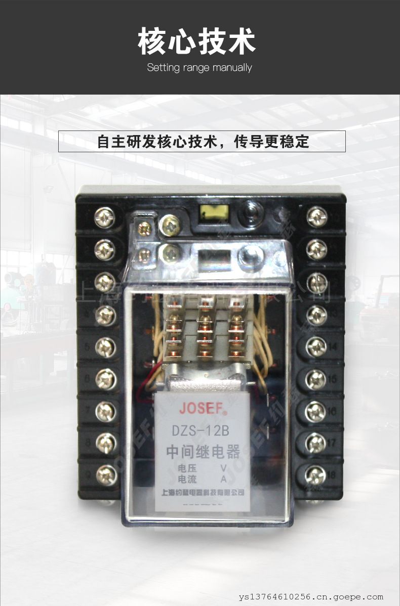 品牌:JOSEF约瑟 型号:DZS-12B DC220V 应用领域:中间 产品系列:DZS系列 触点负载:40W 触点切换电流:220V 系列型号: