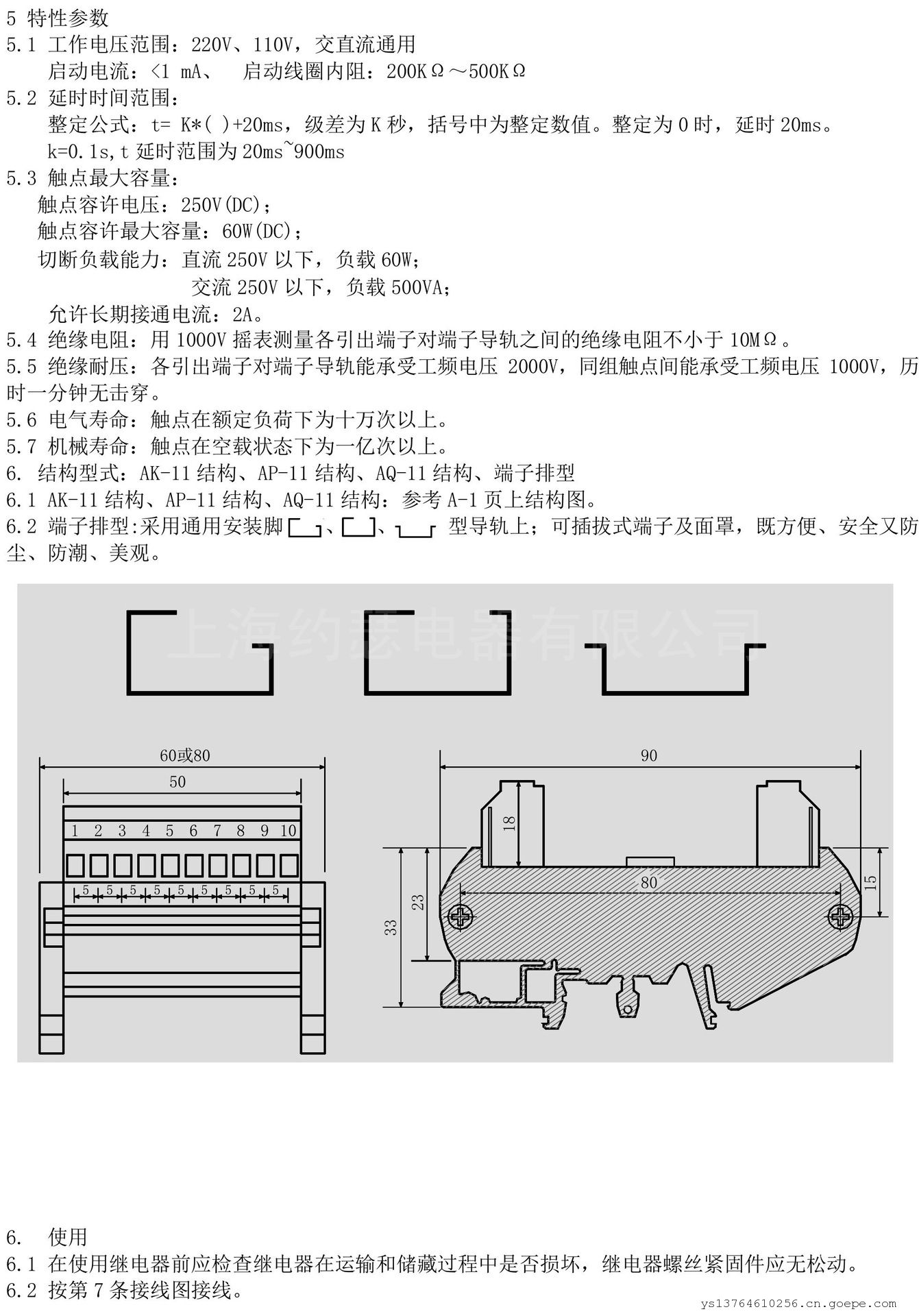 5.1 工作电压范围:220V、110V,交直流通用启动电流:<1mA、启动线圈内阻:200KQ~500KQ5.2延时时间范围:整定公式:t= K*()+20ms,级差为K秒,括号中为整定数值。整定为0时,延时 20ms。k=0.1s,t 延时范围为20ms~900ms