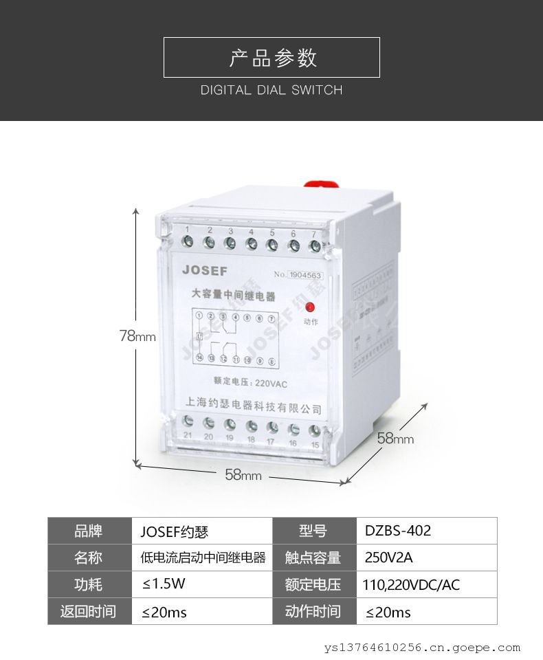 品牌:JOSEF约瑟 型号:DZBS-402 应用范围:中间 额定电流:10 A 额定电压:220 V 触点负载:40 触点切换电流:220 触点形式:一开一闭 应用
