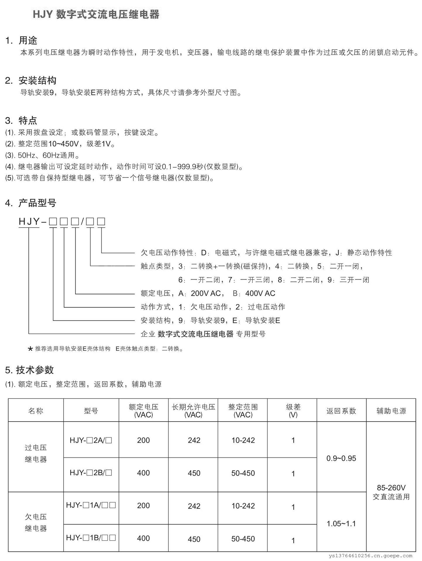 电压继电器 HJY-E1A/4D 整定范围:10-242V 辅助电源:AC/DC85~260V