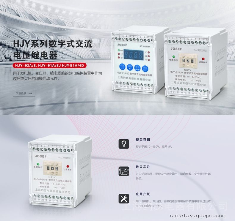 HJY-E1A/4D DC220V电压继电器是一种数字式交流(尽管型号中指定了DC220V,但根据常见命名习惯及约瑟电器的产品线,这里可能存在一个小误差或特指某款定制型号,一般而言应为交流或具备直流处理能力,但具体应以官方文档为准)电压继电器,具有高精度和稳定性。它主要用于发电机、变压器、输电线路的继电保护装置中,作为过压或欠压的闭锁启动元件。